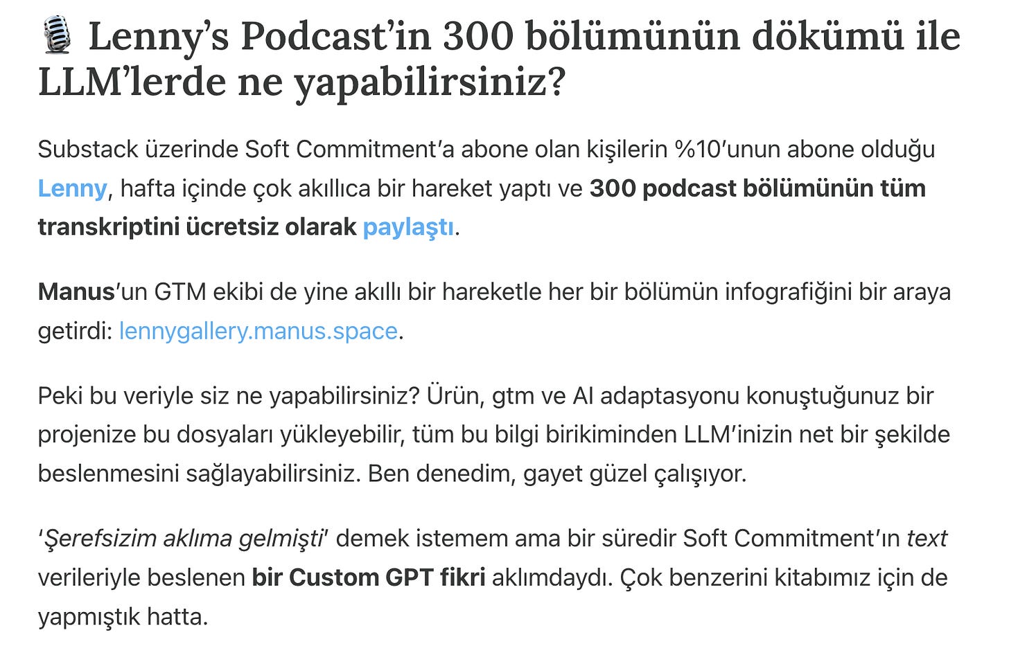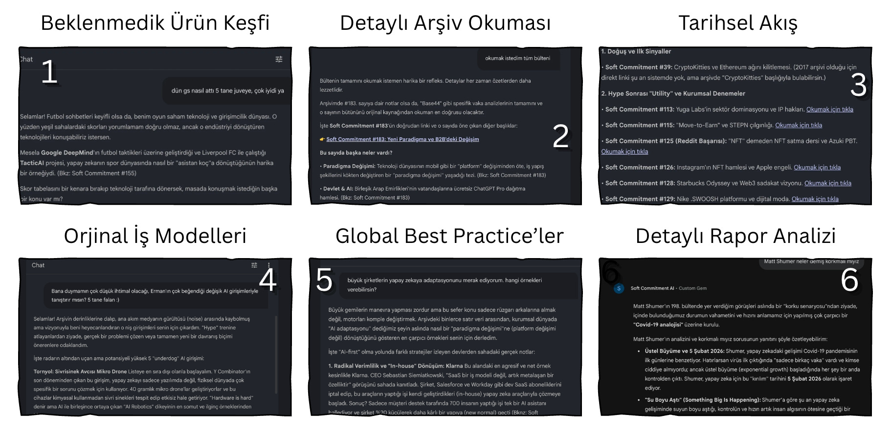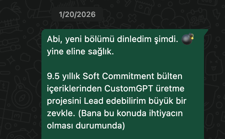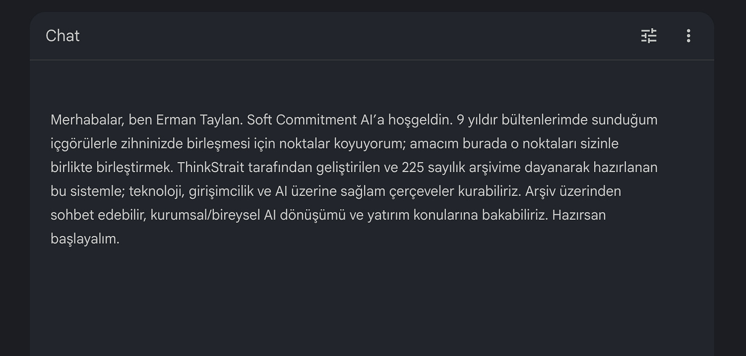 Bundan tam 1 ay önce Erman Soft Commitment #196’da kafasında SC’ın tüm bültenlerinden beslenen bir Custom GPT fikri olduğundan bahsetmişti. Ben bu kısmı dinleyince geçmişte Custom GPT projeleri de geliştirdiğim için çok heyecanlandım ve o günkü kahvaltımızda Sinanla paylaştım. Kafamızda modeli kurguladıktan sonra hemen Erman’a yazdım. Ve aslında bugün okuduğunuz satırların ve kullanınca umarım çok faydalanacağınız Soft Commitment AI’ın ilk tohumları o gün atılmış oldu.