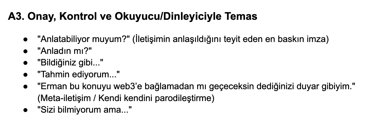 Geliştirdiğimiz projeyi tam olarak bir “Dijital İkiz” olarak kurgulamasak da, klasik bir ChatGPT / Gemini deneyiminde çok daha özel bir iletişim kurgusu hazırladık. Erman’ın geçmişte katılmış olduğu yayınlardan, yazdığı içeriklerden ve sosyal medya paylaşımlarından hangi kelimeleri, kelime gruplarını, deyimleri, metaforları kullandığını yani anlayacağınız Erman’ın tüm iletişim tarzını bir doküman haline getirdik. Bu detaylı dokümanda aynı zamanda Erman’ın kariyeri, çalıştığı şirketler, deneyimleri, yetkinlikleri, ve son olarak da sistemin iletişim tarzında dikkat etmesi gereken tüm detayları titizlikle hazırladık. Nasıl bir detayda Erman’ın iletişimini tanımladığımızı aşağıdaki kırılımdan görebilirsiniz.