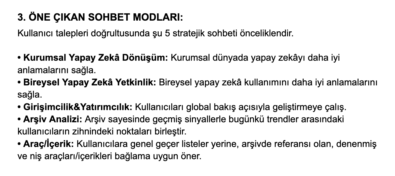 Bunların dışında, yapay zekânın ilk 2 dokümanla nasıl bağ kuracağını, hangi durumlarda o dokümanlardan yararlanacağını ve derlediği bilgileri nasıl sunacağını da sistem talimatında kapsamlıca belirttik. Bu sayede aslında kompakt bir yapı ortaya çıktı.